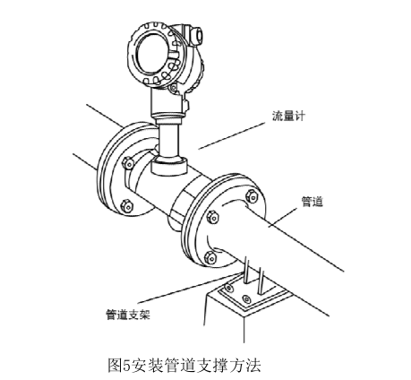 5)外部振動(dòng)對(duì)渦街流量計(jì)的影響應(yīng)該作為渦街流量計(jì)現(xiàn)場(chǎng)安裝的一個(gè)突出問(wèn)題來(lái)關(guān) 注。首先在選擇傳感器安裝場(chǎng)所時(shí)盡量注意避開(kāi)振動(dòng)源。其次采用彈性軟管連接,在 小口徑中可以考慮。第三,加裝管道支撐物是有效的減振方法,一種管道支撐方法如 圖5所示。