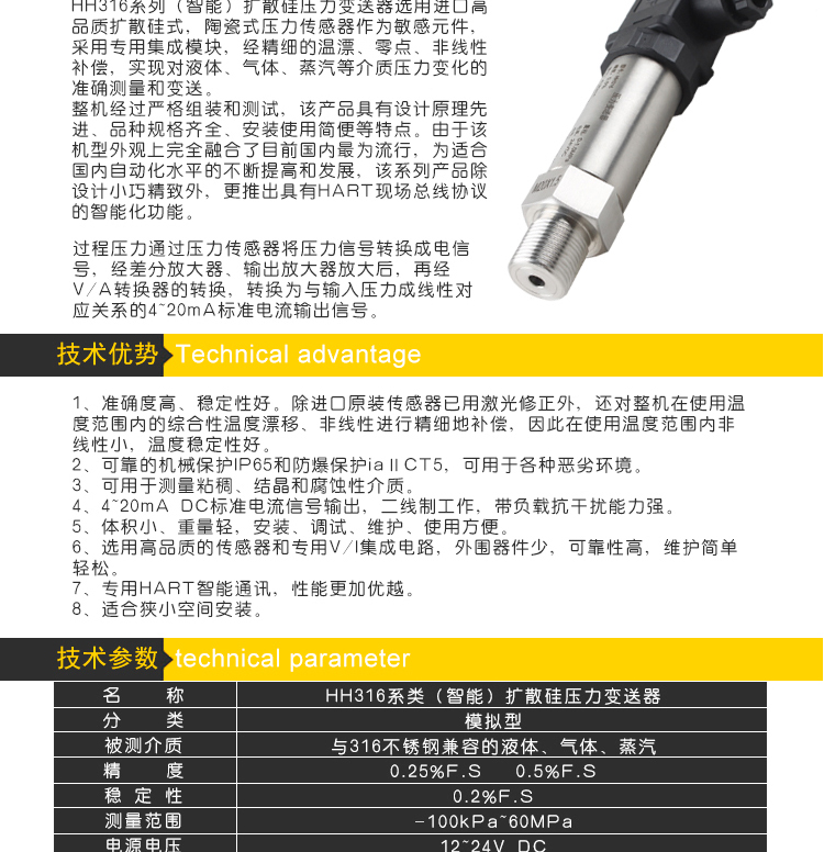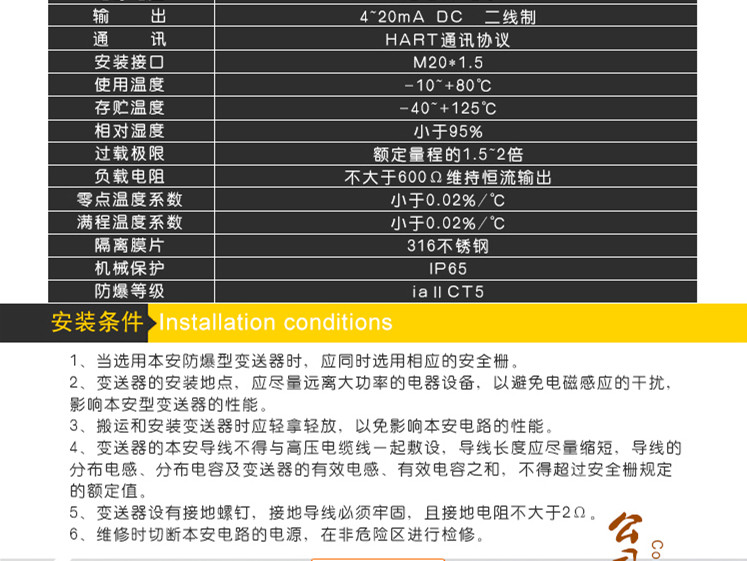 準(zhǔn)確度高、穩(wěn)定性好;可靠的機(jī)械保護(hù)IP65和防爆保護(hù)iaⅡCT5,可用于各種惡劣環(huán)境;可用于測量粘稠、結(jié)晶和腐蝕性介質(zhì);4~20mA DC標(biāo)準(zhǔn)電流信號(hào)輸出,二線制工作,帶負(fù)載抗干擾能力強(qiáng)。...